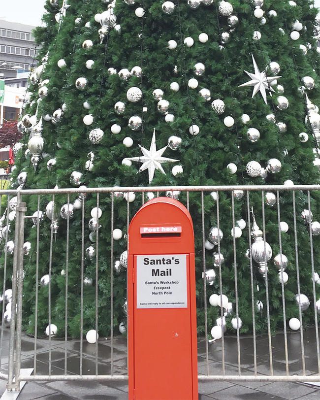 24 Nov 2016 雨上がりのNewmarketで見つけた、大きなクリスマスツリー。そして、その下に置いてあるポストには"Santa's Mail"の文字が。クリスマスまであと一ヶ月、今年はどんな贈り物をお願いしようかな♪