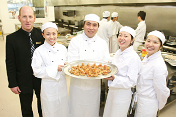 英語環境での調理学生生活スタート この4月、ノースショア料理・ホスピタリティー専門学校 (以下NSIA) のプロ調理師・資格コース (National Certificate in Professional Cookery Level 4) に入学した坂田光春さんは現在1ターム目で、平日月曜日から金曜日まで講義を中心とした内容の授業を受けている。決まりきったテキストブックはなく、そのつど教師が内容に見合った資料を用意する。授業ではロールプレイディスカッションなどのほか、衛生管理などの専門的なことも学ぶ。ユニークな課題なのが、 5人くらいの1チームで架空のレストランを作るというもの。そのレストランでのコンセプト、役割分担、メニューや料金を考えたり、レストランというものが どのように成り立っているかを研究する。料理人として以外に、ビジネス、ホスピタリティなどさまざまな観点からレストランを眺め、実技だけではなく分析力、協調性なども養う。